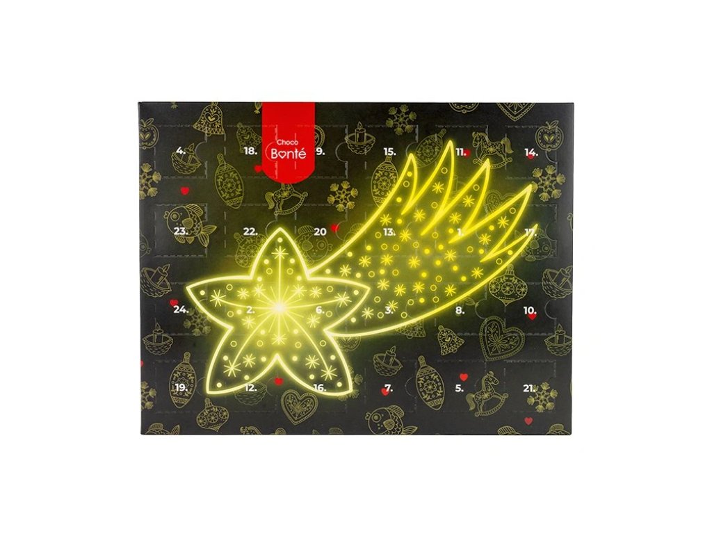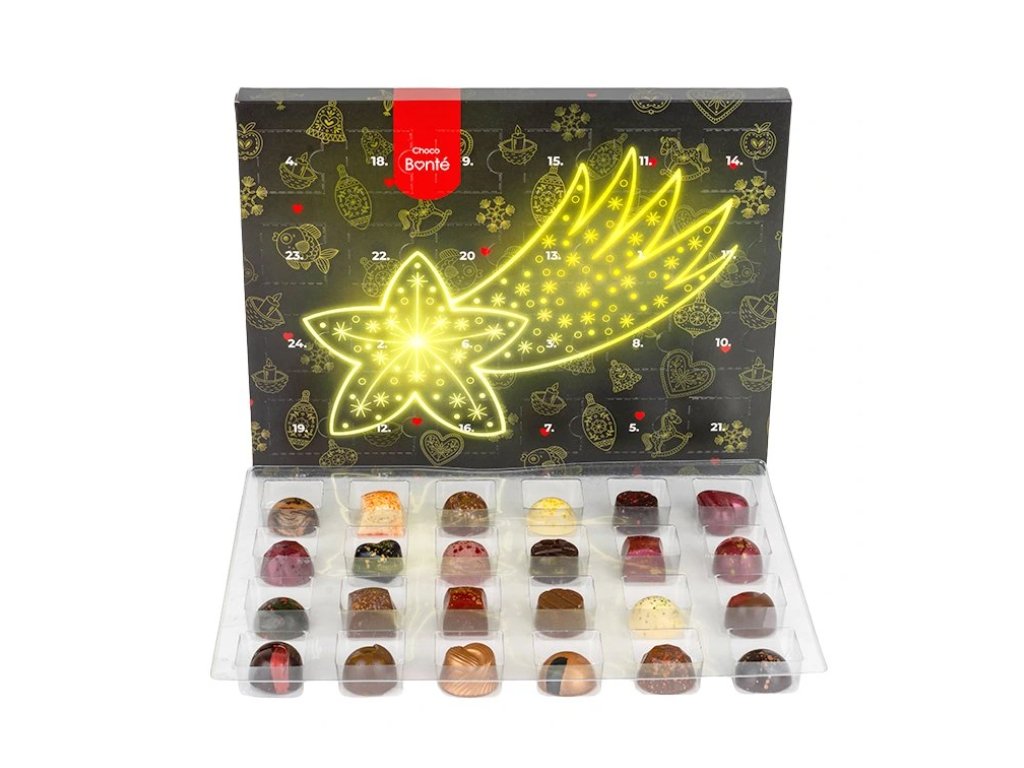 Originální adventní kalendář s pralinkami od Choco Bonté přináší 24 ručně vyráběných kousků prémiové čokolády, které zpříjemní čekání na Vánoce. Každý den odhalíte novou chuť z poctivých surovin a bez palmového oleje – ideální dárek pro děti i dospělé.