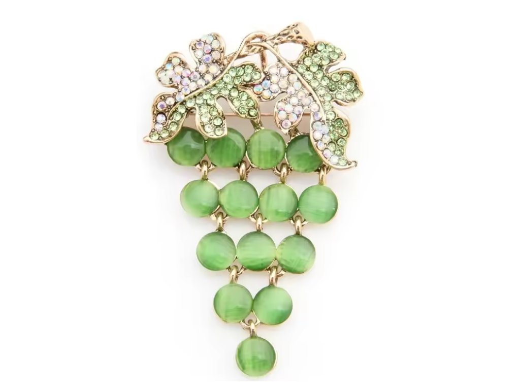 Elegantní brož s motivem hroznového vína je stylovým doplňkem, který potěší každého vinaře, someliéra nebo milovníka vín. Vynikne na saku, halence či klobouku a symbolicky odkazuje na lásku k vinařství a přírodě.