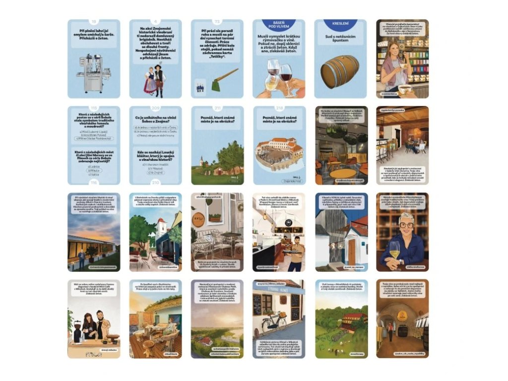 - Hra obsahuje: Herní deska, 480 karet s tematikou vinic, výroby vína a vinařských tradic, 48 žetonů, 4 figurky, hrací kostku, pravidla hry