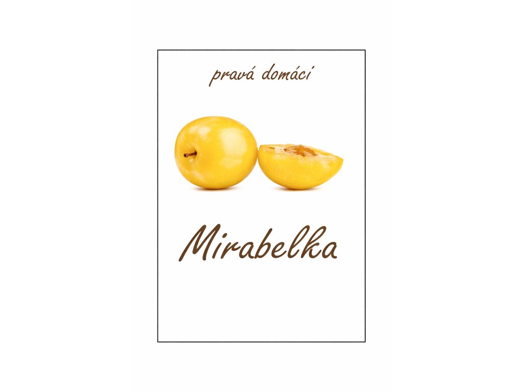 Decentní jemná etiketa na lihoviny viz. fotografie s motivem mirabelky a textem Pravá domácí mirabelka.