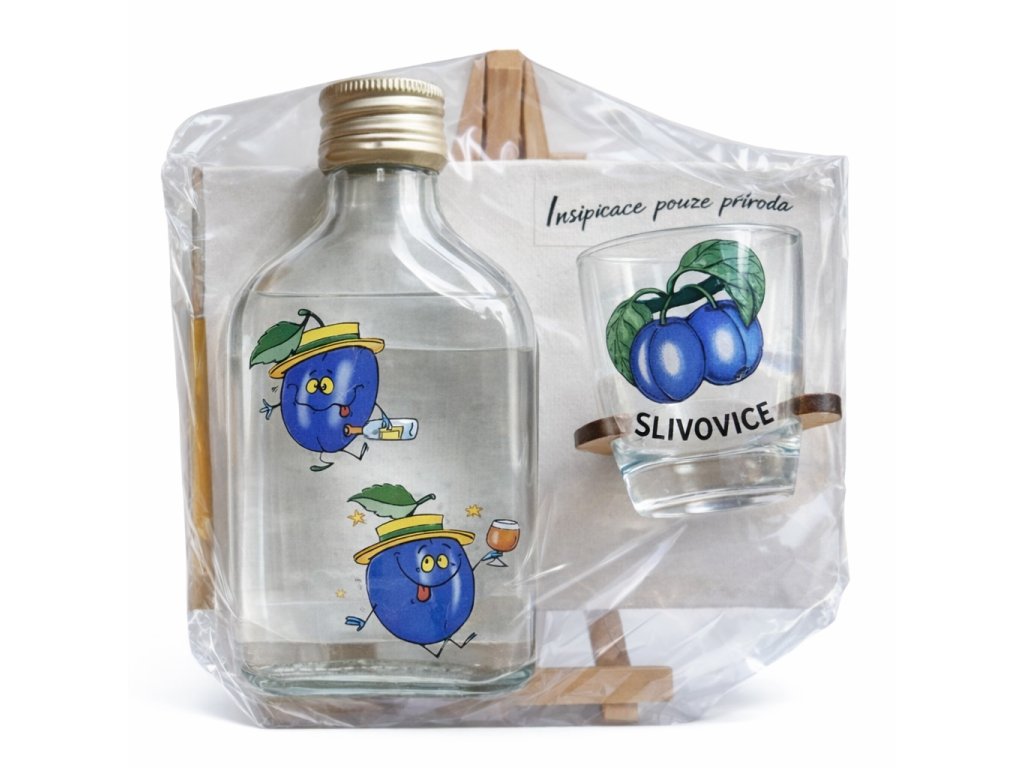 Malířské plátno s panákem a lahvičkou slivovice je vhodným dárkem zejména pro umělce. Součástí je také štěteček.