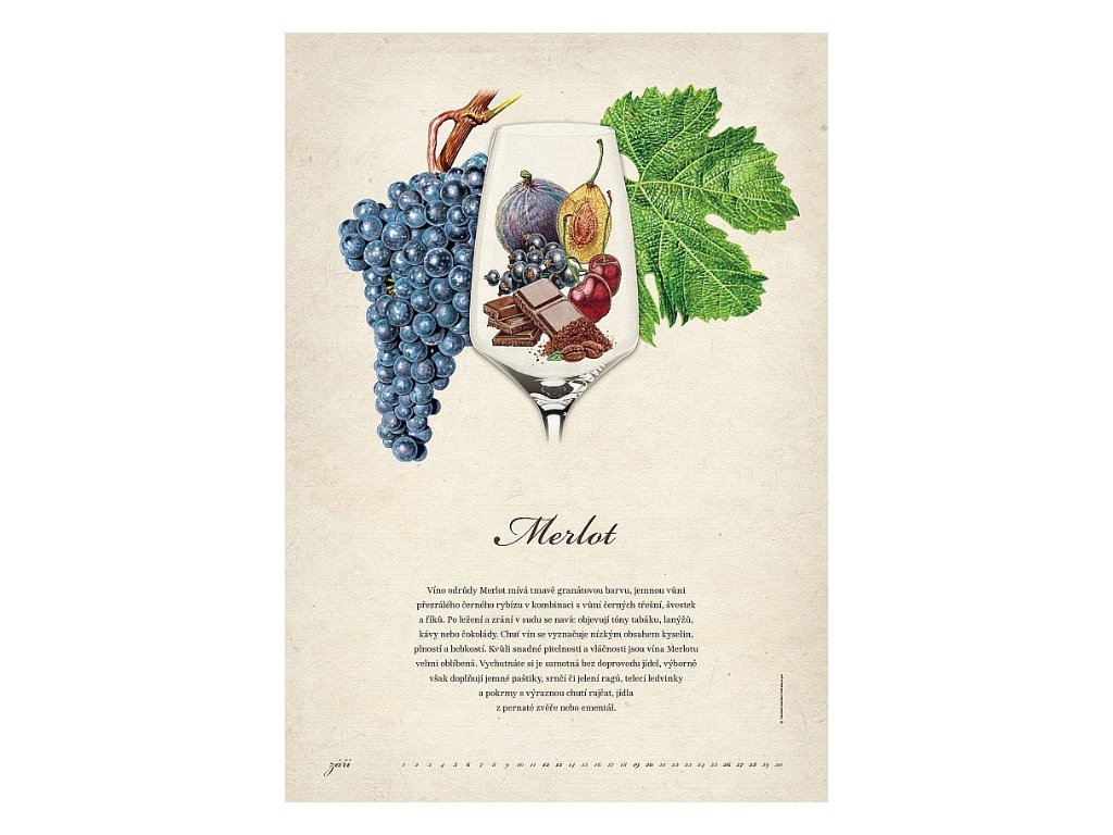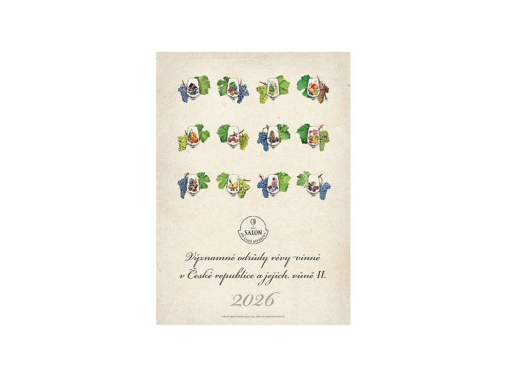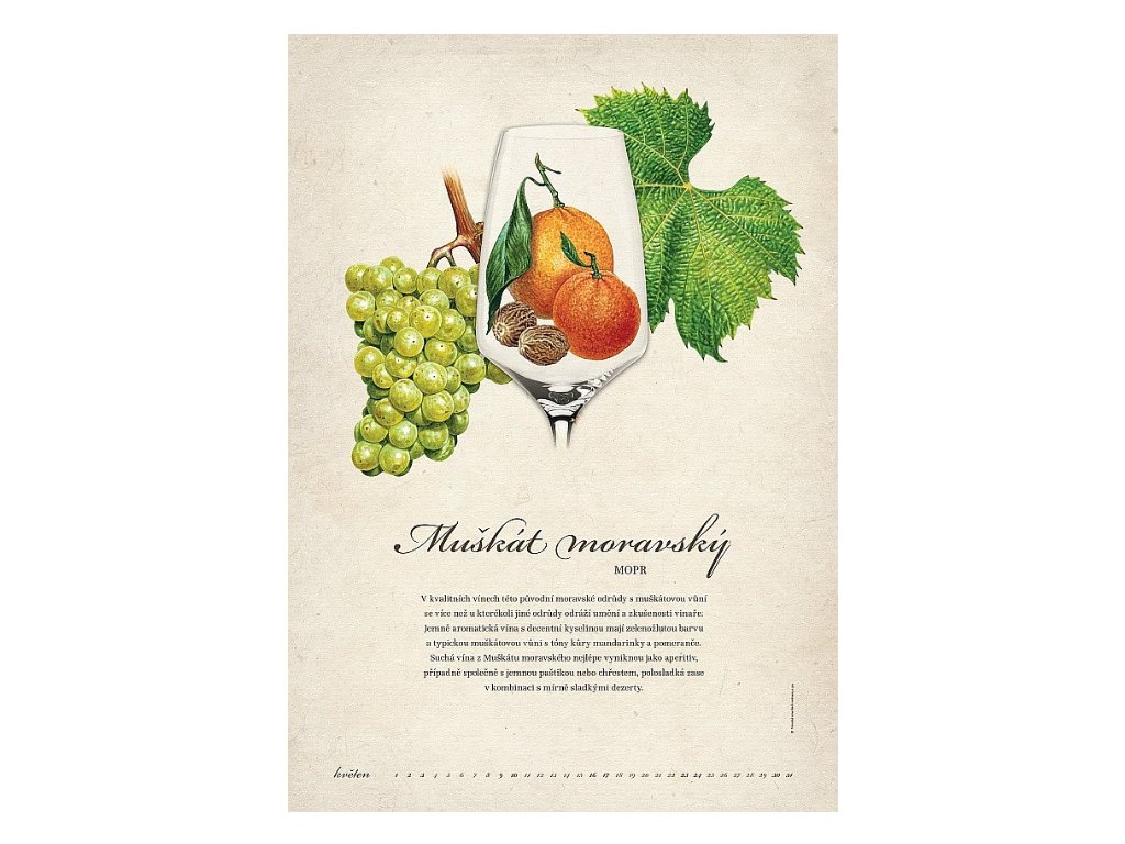 Pokračování loňského a předloňského nástěnného kalendáře s krásnými malbami dalších odrůd pěstovaných v ČR. Kromě věrného zobrazení hroznu a listu moštových odrůd révy vinné, přehledu dnů v měsíci a textových charakteristik obsahuje i kresby nejtypičtějších vůní vín odrůd: Cabernet Cortis, Agni, Rubinet, Kerner, Florianka, Děvín, Aurelius, Solaris, Irsai Oliver, Neronet, Veltlínské červené rané a Alibernet.