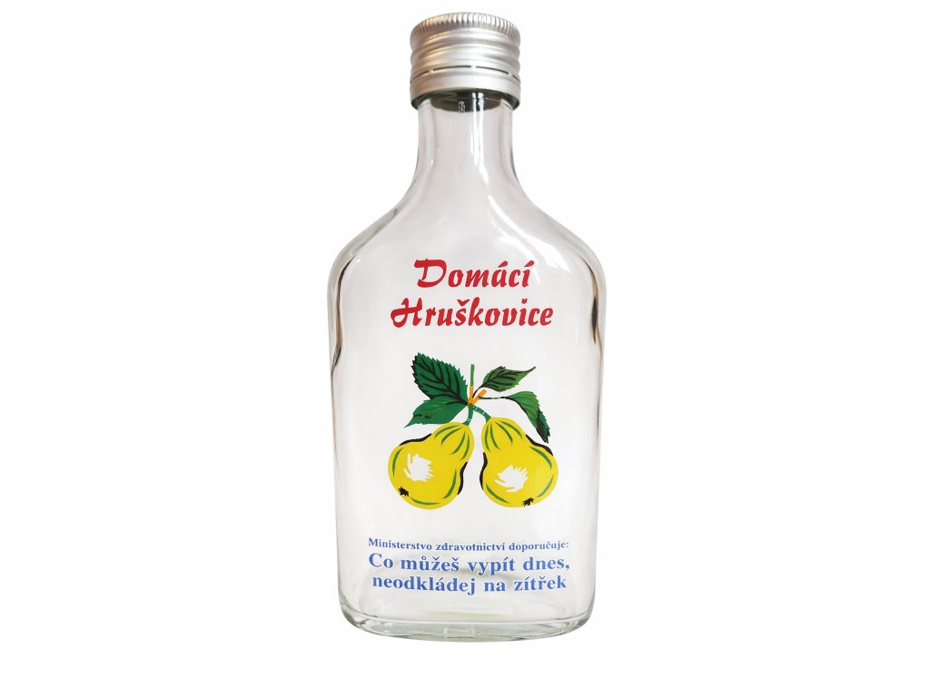 - Potisk: „Domácí hruškovice“ s obrázkem a textem „Ministerstvo zdravotnictví doporučuje: co můžeš vypít dnes neodkládej na zítřek“