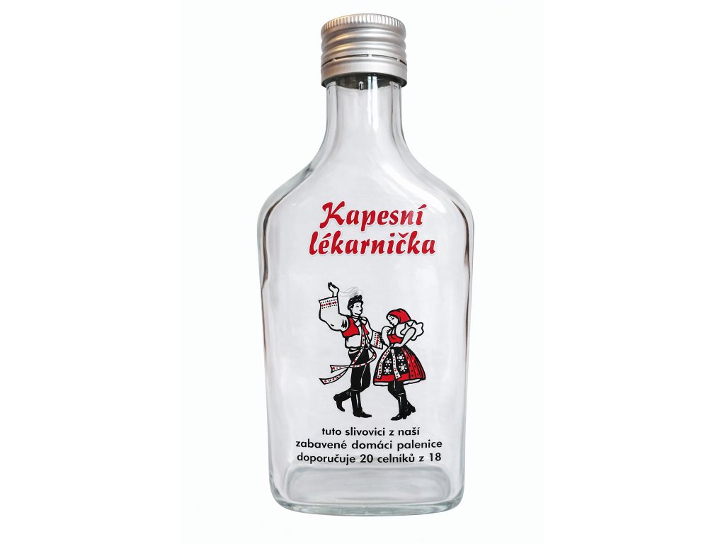 Stylová kapesní láhev s originálním potiskem je praktickým řešením pro uchování menšího množství domácí pálenky. Díky plochému tvaru se snadno přenáší a pevné sklo spolu se šroubovacím uzávěrem zajistí bezpečné uzavření bez rizika úniku obsahu.