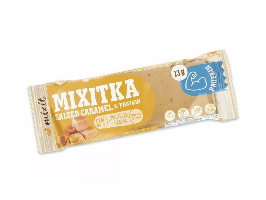 Proteinová Mixitka BEZ LEPKU – Slaný karamel je navržená pro všechny, kdo hledají rychlou a chutnou svačinu bez lepku. V každé tyčince najdete kombinaci rozpustné vlákniny, micelárního kaseinu, CFM syrovátkového proteinového koncentrátu, arašídového másla a mandlí, díky čemuž má tyčinka příjemně plnou chuť i sytější charakter. Slaný karamel dodává celé receptuře vyvážený sladko-slaný profil, který se hodí na cesty, do práce, do školy i po fyzické aktivitě.