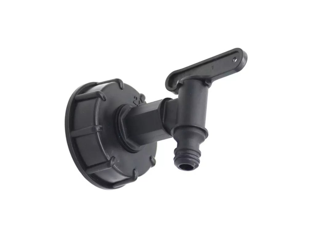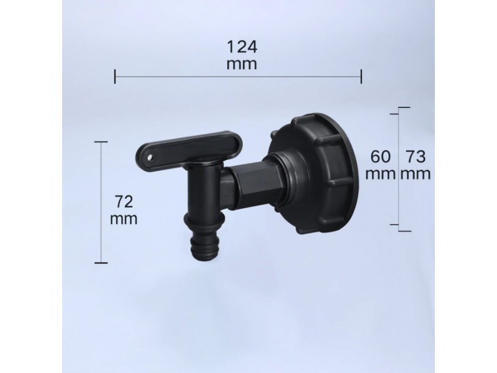 Uzávěr IBC sada -s plastovým ventilem 3/4", těsněními a koncovkou na rychlospojku. Vstup 60 mm hrubý závit. Velikost připojení hadice 15 mm. Vyrobeno z plastu v černé barvě.