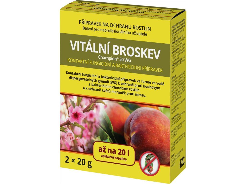 Vitální broskev je praktická souprava přípravků pro dvojí ošetření broskvoní v období před rašením. Obsahuje fungicid Champion 50 WG ve formě ve vodě dispergovatelných granulí, který působí kontaktně proti houbovým a bakteriálním chorobám. Díky obsahu mědi vytváří na povrchu rostlin ochranný film, který brání pronikání patogenů do rostlinných pletiv. Přípravek je vhodný nejen pro broskvoně, ale i pro další ovocné dřeviny, zeleninu či okrasné rostliny.
